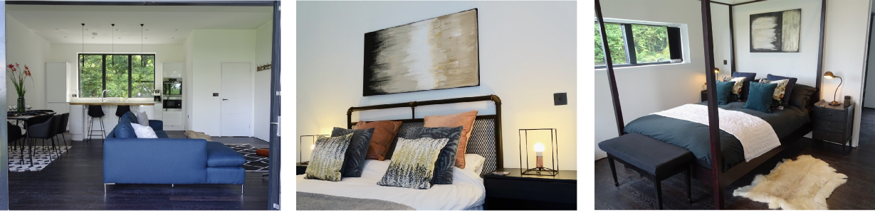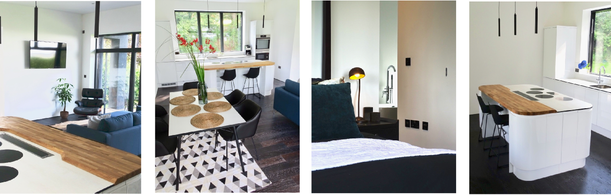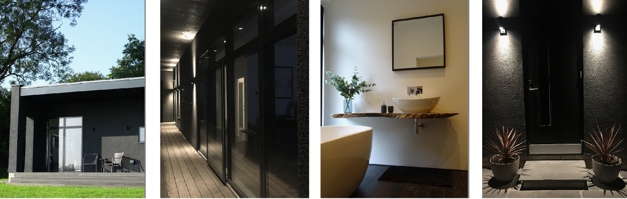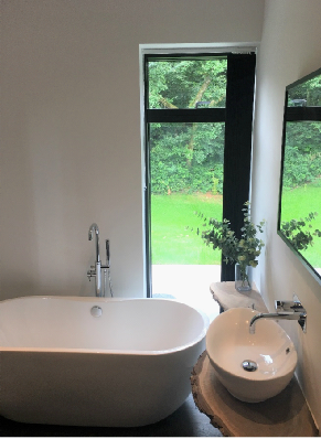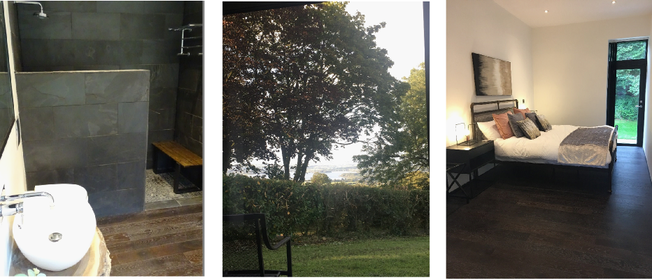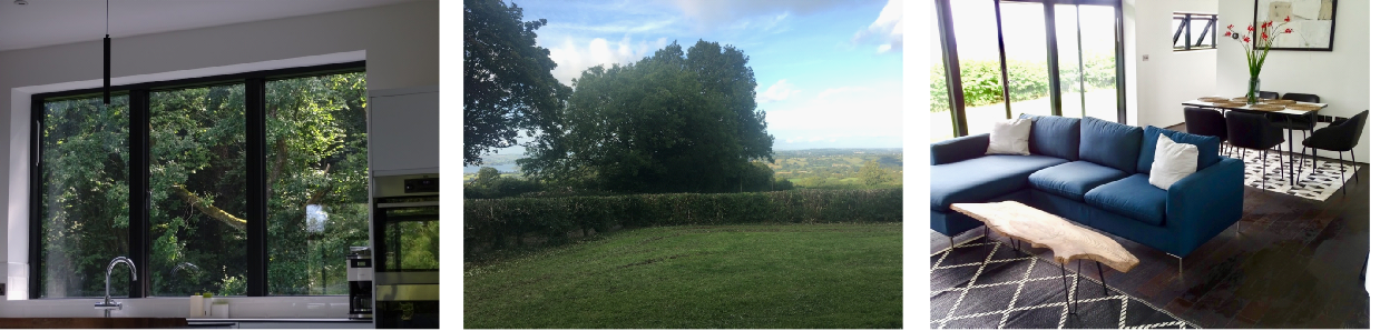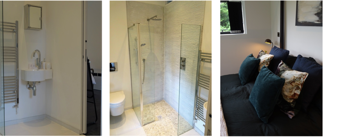 The annexe was designed to be a two-bed building with a bathroom and an ensuite. The main living and bedroom areas face out onto a decked veranda which has fantastic views over the Mendips. The whole building is low level to be modest and minimal within the landscape. The simple and minimal design is carried forward with the internal fittings.
